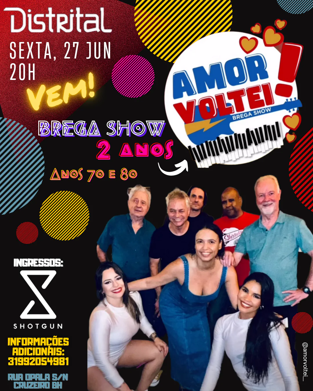 Já estão à venda, os ingressos para o Amor Voltei Brega Show. O evento que celebra 2 anos de vida da Banda Amor Voltei, acontece no Distrital (Rua Opala, s/n – Cruzeiro – BH), no dia 27 de junho, sexta-feira, às 20h.