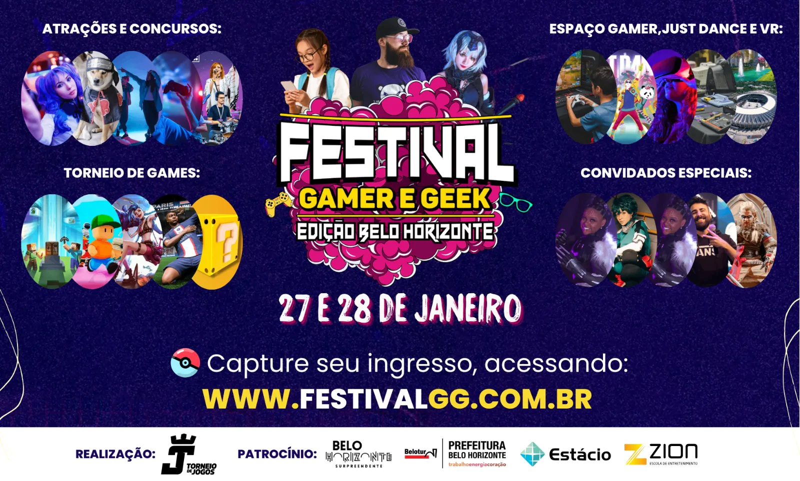 O “Festival Gamer e Geek – Edição Belo Horizonte” é uma realização do Torneio de Jogos, com patrocínio da Belotur, Estácio Belo Horizonte e Zion Escola de Entretenimento.