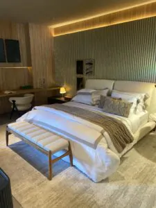 As arquitetas Mariana Borges e Thaysa Godoy, criadoras da Suíte de Hotel Memorável, convidaram a artista Aline Bergson a desenvolver um trabalho especialmente para o ambiente. ”Queríamos um pôr do sol e ela criou lindamente a obra “SUNSHINE” com ágata de fogo, citrino e quartzo transparente. O resultado nos surpreendeu, pois além de lindo ele transmite uma energia contagiante!”, destaca Thaysa Godoy. O espaço ainda recebe trabalhos do fotógrafo João Farkas e e de Marcos Coelho Benjamim.