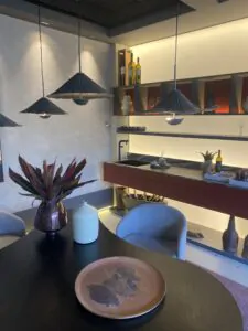 O Estar e Jantar Voktum, de Denise Vilela, conta com uma intervenção produzida especialmente para o ambiente, desenvolvida no local pelo artista niteroiense Rafael Vicente a partir do conceito do espaço. Nathália Mariana Castro, diretora da Galeria Murilo Castro, destaca a parceria com arquiteta: “A Denise é uma profissional que valoriza muito a presença da arte nos seus projetos. Ela é ousada e faz questão de repassar aos clientes a importância dessa relação e os benefícios da arte para quem usufrui dela no seu dia a dia. Ela também possui um olhar bem antenado e auxilia os clientes na de fazer boas escolhas, inclusive apresentando o trabalho de novos artistas.”
