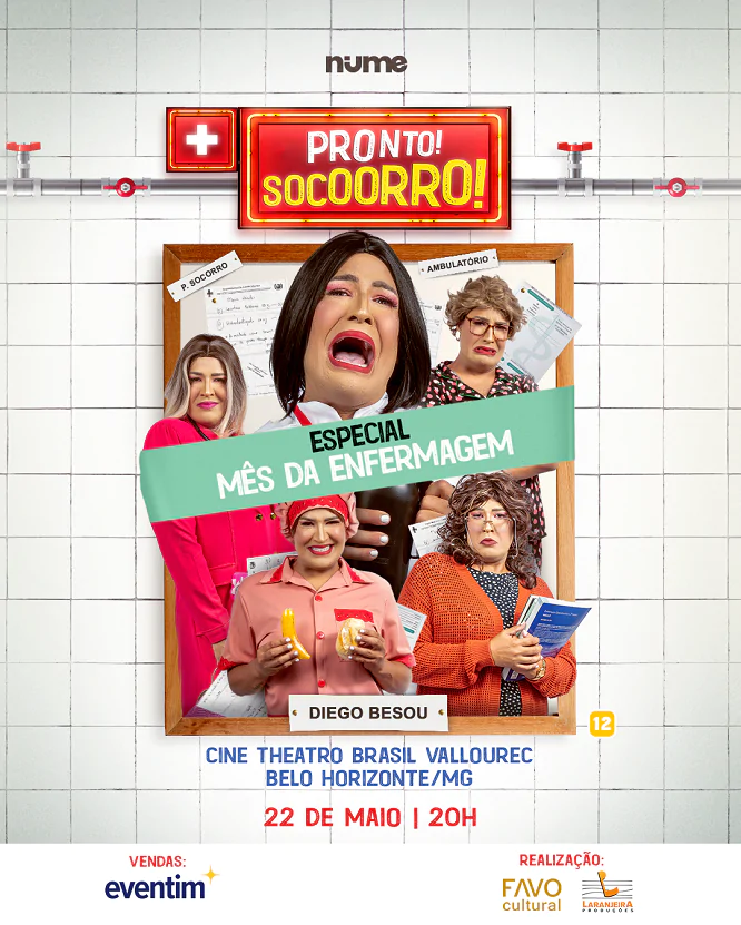 O comediante Diego Besou apresenta sua peça “Pronto! Socoorro!” , no Grande Theatro do Cine Brasil Vallourec no dia 22 de maio (quarta-feira) as 20h. O espetáculo como você nunca viu sobre a área da saúde. Afinal, as coisas que acontecem em um pronto-socorro até Deus duvidam!