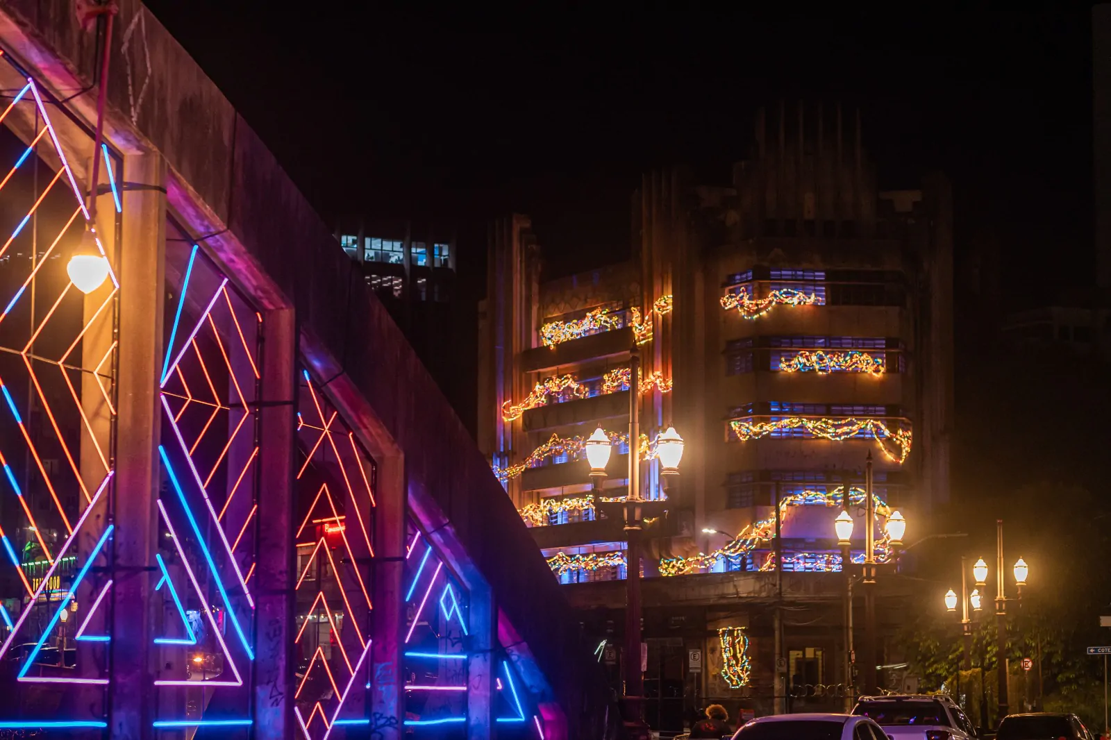 O duo formado pelo casal Lula Duffrayer e Flávio Carvalho, por trás do Pirilampos do Planeta, usa lixo plástico para criar esculturas em formato de correntes coloridas e iluminadas. Elas estarão expostas no Edifício Chagas Dória, compondo o Circuito da Luz.