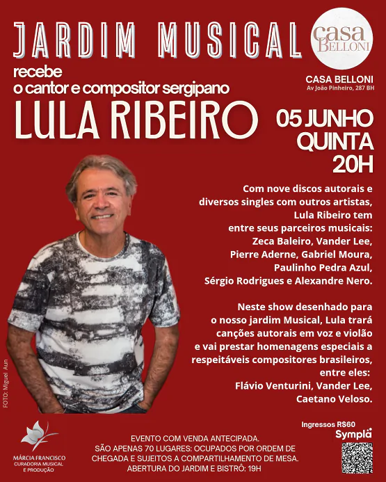 O Jardim Musical já tem ingressos à venda para o show do dia 05 de junho, quinta-feira, às 20h30, na Casa Belloni (Av. João Pinheiro, 287 – BH – MG).  O projeto sob curadoria da jornalista Márcia Francisco, recebe o cantor e compositor sergipano, Lula Ribeiro. O show marca o lançamento do single “Era você”, em parceria com Sérgio Rodrigues – disponível nas plataformas digitais a partir do dia 30 de maio.