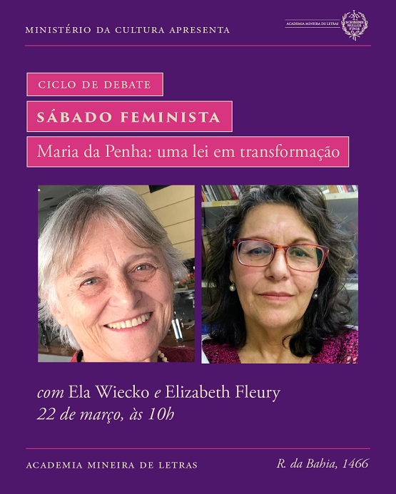 SERVIÇO: Sábados Feministas: Maria da Penha, uma lei em transformação Palestra com a jurista e pesquisadora Ela Wiecko e mediação da socióloga Elizabeth Maria Fleury-Teixeira Data: 22/03, sábado, às 10h Local: Academia Mineira de Letras (Rua da Bahia 1466 – Lourdes) Entrada gratuita. |