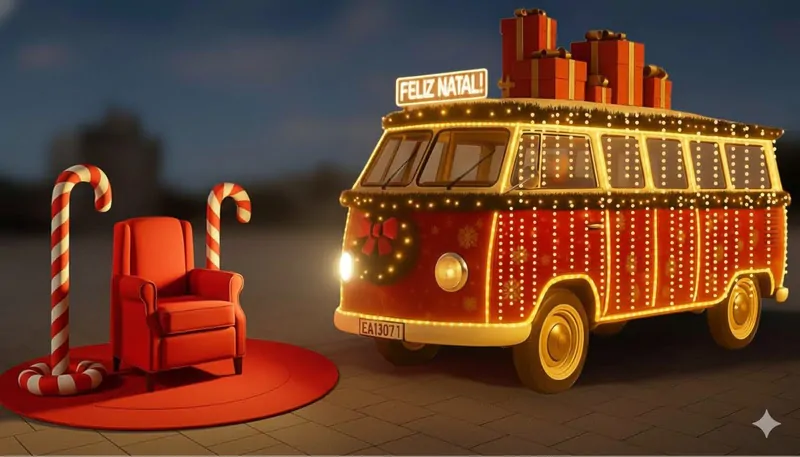 A magia do Natal sobre rodas! A Kombi personalizada vai percorrer a cidade levando alegria, parando nas árvores iluminadas e oferecendo fotos gratuitas com o Papai Noel para toda a população