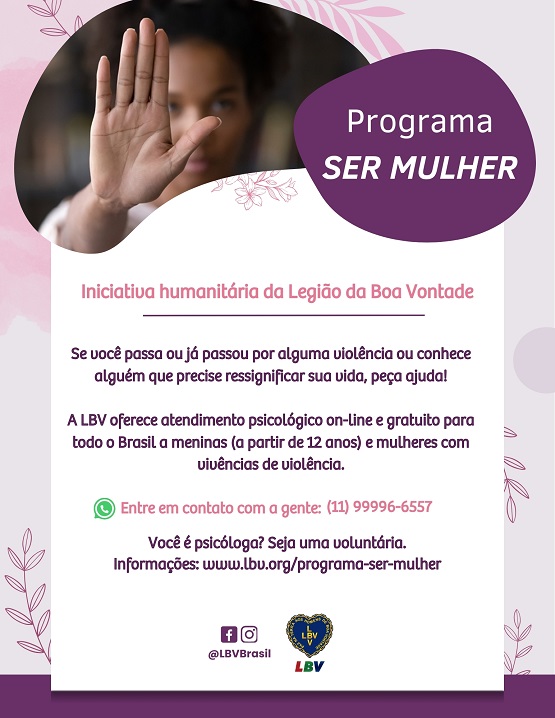 - Apoio psicoterapêutico: Para pessoas que vivenciam ou já vivenciaram situações de violência e vulnerabilidade extrema, a LBV disponibiliza o programa Ser Mulher , direcionado a pessoas do gênero feminino a partir dos 12 anos, oferecendo até 30 atendimentos psicológicos semanais on-line e gratuitos, além de orientação social. Os atendimentos também se estendem aos filhos e filhas de mulheres que vivenciaram situações de violência de gênero.