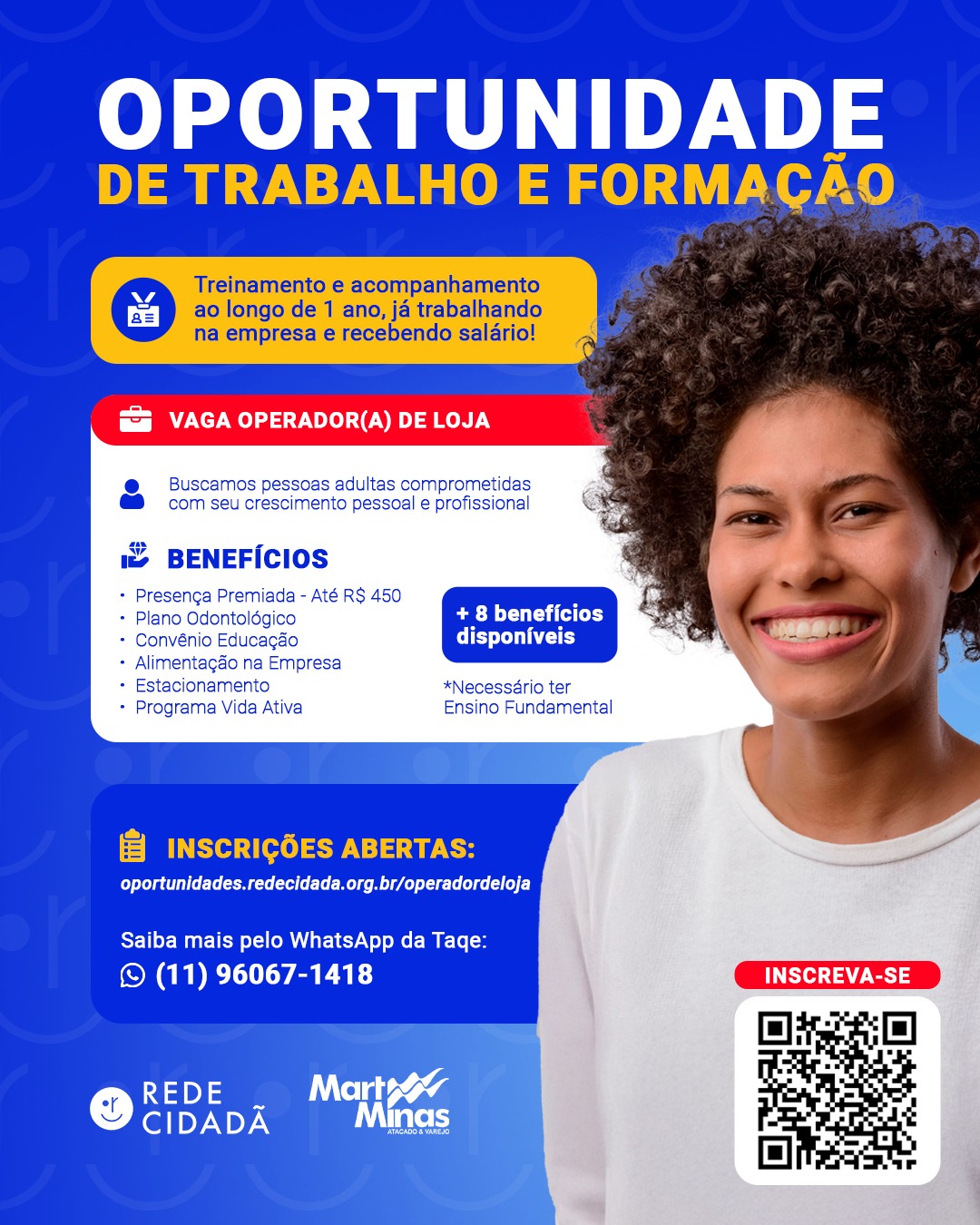 A Rede Cidadã está com 180 vagas abertas para operador(a) de loja. As oportunidades são para pessoas com ensino fundamental completo e incluem carteira assinada e um programa gratuito de formação profissional com duração de um ano.
