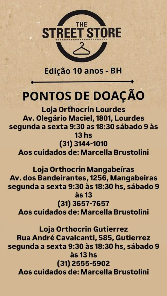 📍 Pontos de coleta: lojas Orthocrin do Gutierrez, Mangabeiras e Lourdes. Para mais detalhes, veja nosso Instagram.