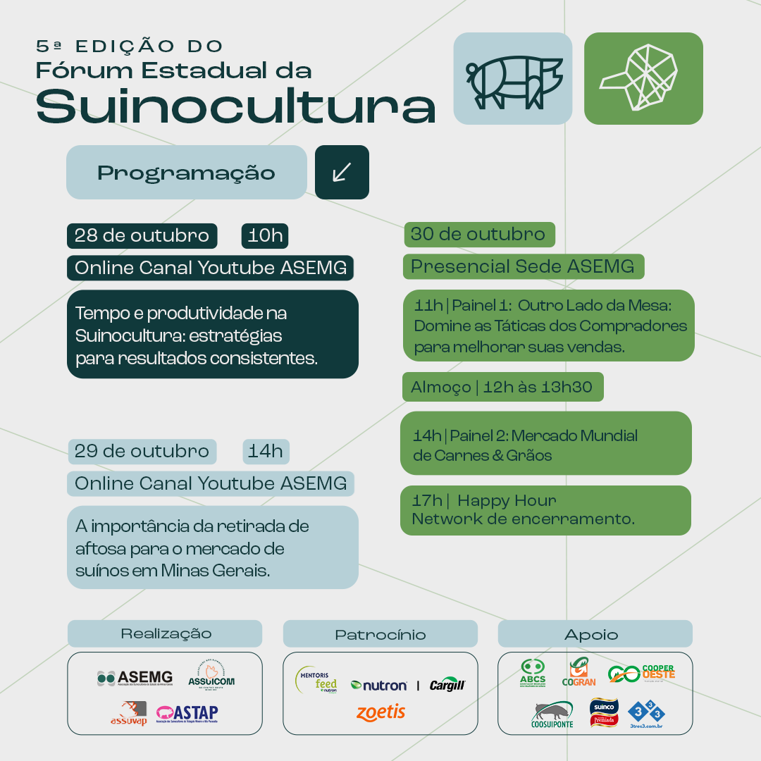 A abertura ocorrerá de forma online no dia 28 de outubro (segunda-feira) às 10h, através do Canal do Youtube da ASEMG, com a palestra “Tempo e produtividade na Suinocultura: estratégias para resultados consistentes.”