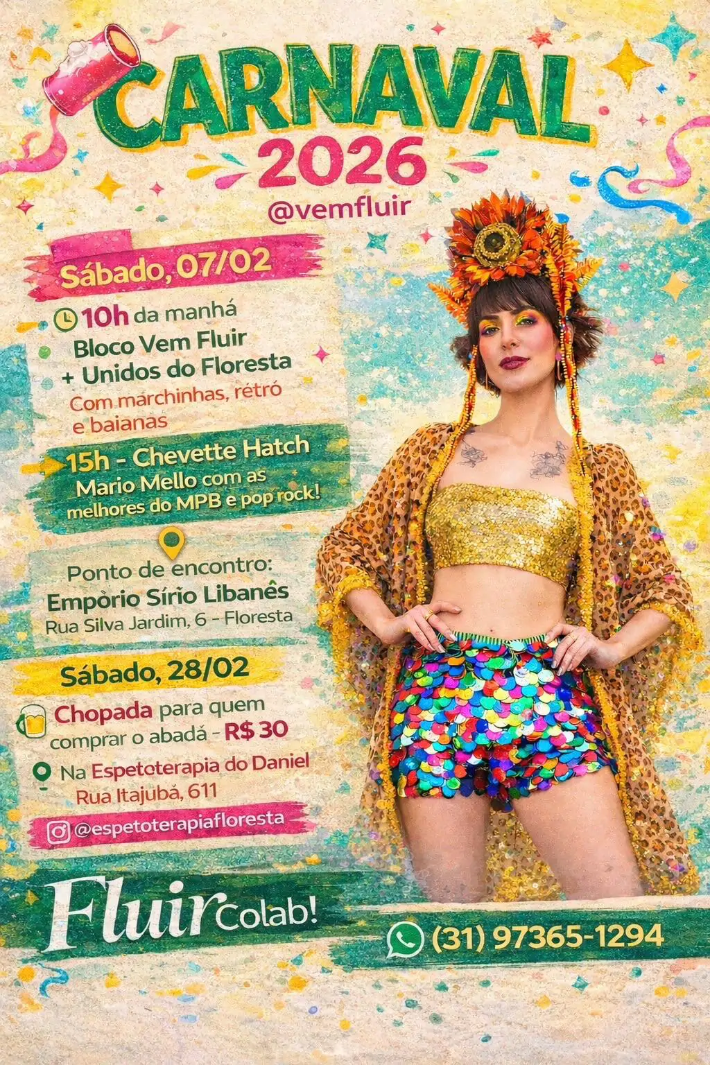 Como parte da programação de Carnaval, no sábado, 07 de fevereiro, a Fluir Colab ocupa um quarteirão da Rua Silva Jardim com o Bloco Vem Fluir, que neste ano se une ao tradicional Unidos do Floresta. O ponto de encontro será no Empório Sírio Libanês, na Rua Silva Jardim, 6, reunindo foliões de todas as idades.