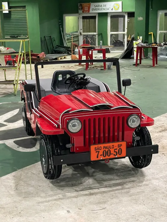 Estrutura: O artista trabalhou desenvolvendo todo visual do Jeep junto com o Marcelo e a equipe de cenografia, e construiu a carcaça com materiais leves – já que em alguns momentos ele teria que ser erguido pelos bailarinos – e também em alguns detalhes técnicos como encaixes para fixação do Jeep em outra estrutura cênica.