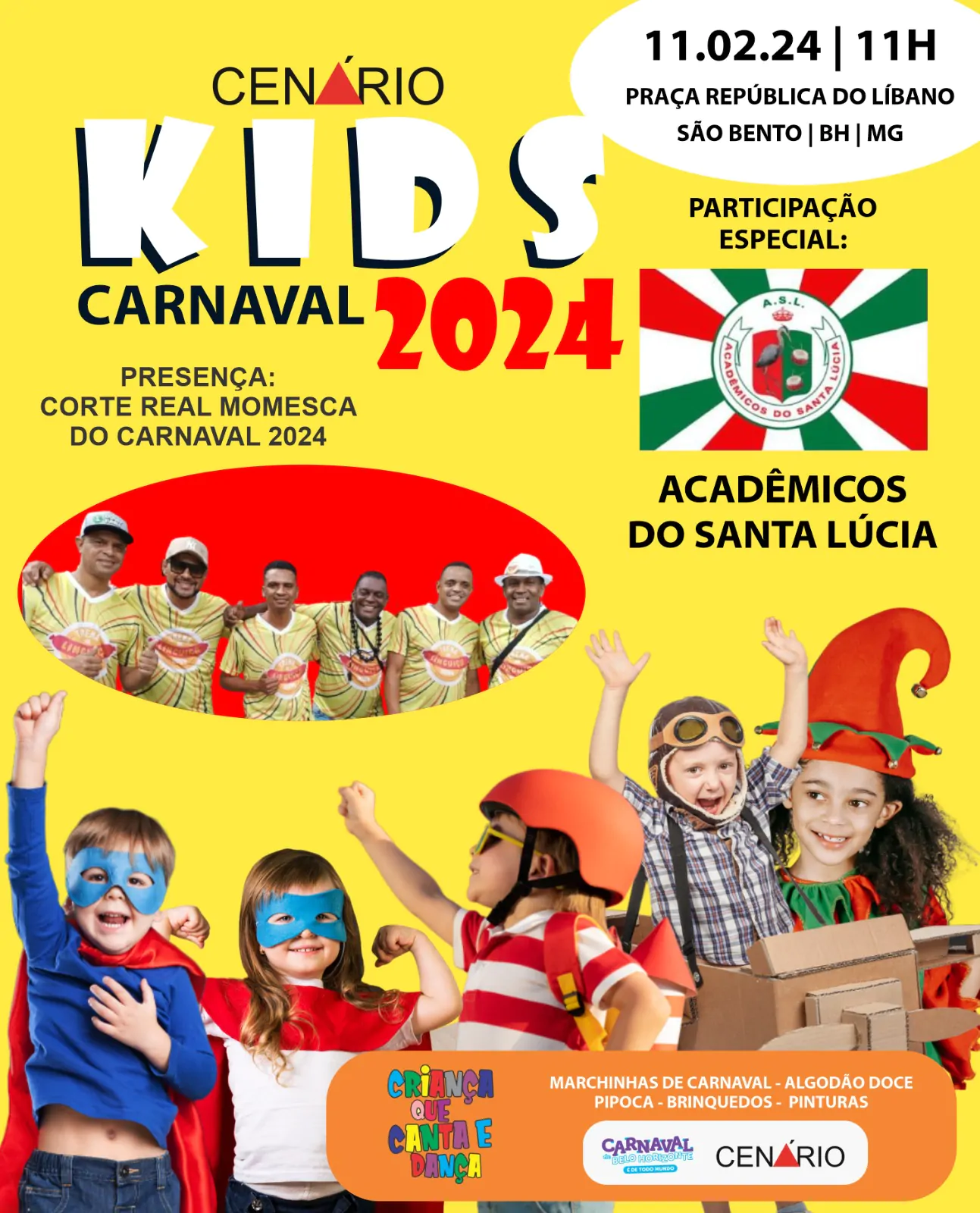 Para 2024, a programação da Cenário Kids apresenta a presença da Corte Momesca de Belo Horizonte formada pelo Rei Momo Wallace Guedes, a Rainha Aline Caldeira e a Princesa Raíssa Medeiros. Do famoso maquiador Jorge Ribeiro, da S e J Baeauty, que fará as maquiagens nos pequenos, as musas dos times mineiros também terão presença garantida no evento, com Natália Favato, Nayara Cristina e Rayanne Santos.