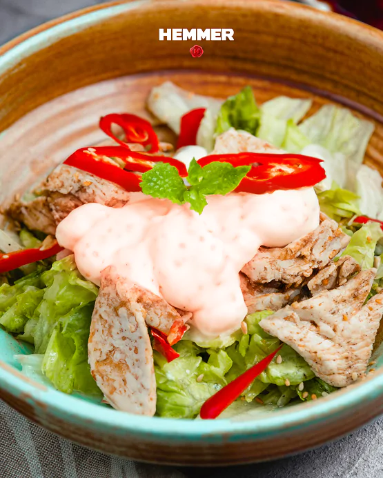 - Finalize a salada com o molho rosê: misture a maionese Hemmer e ketchup Hemmer e ajuste o sal caso necessário;