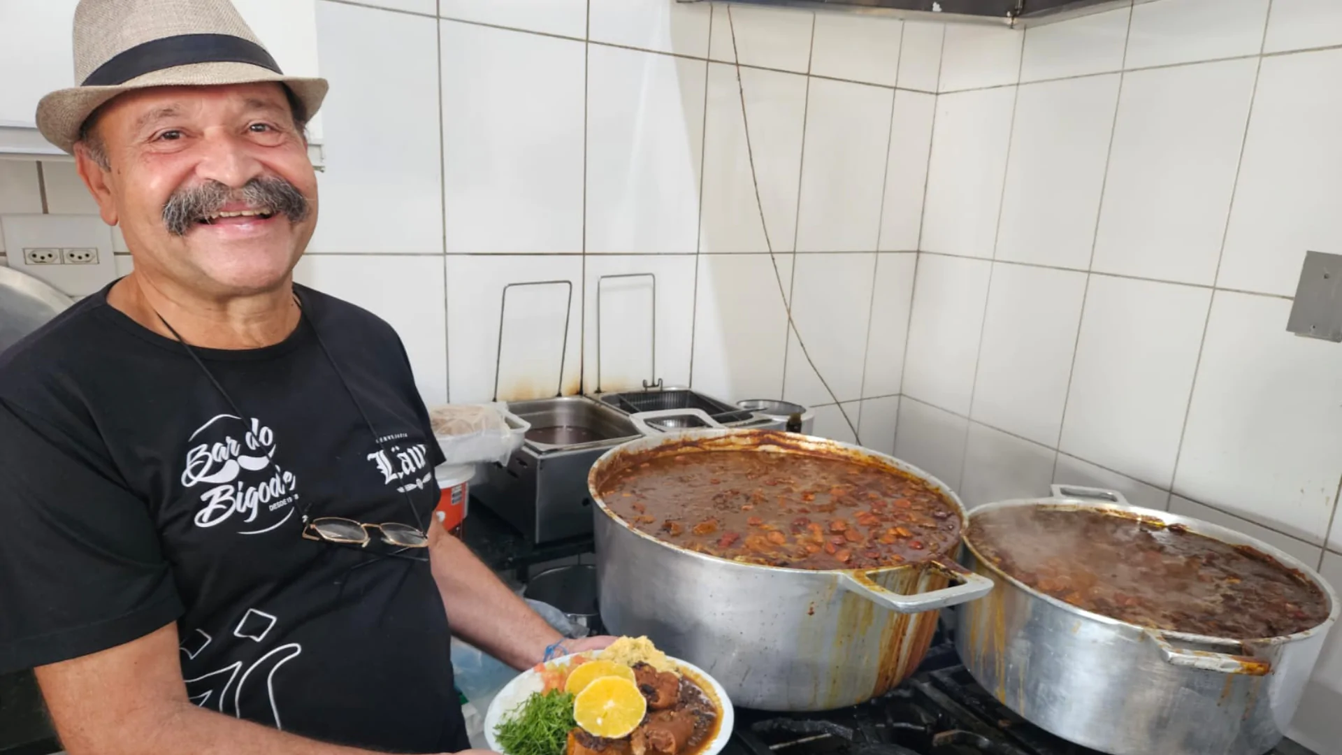 “Nosso almoço é servido até as 14h, mas em dia de feijoada, sempre acaba mais cedo”, conta Omar Ferreira Cunha, o Bigode, dono do bar e criador da receita famosa. E não é só pela turma que vai comer no bar, mas pelas centenas de pedidos pelo telefone e os fregueses que chegam com panelas para encher e levar pra casa. “Uma vez, um só cliente levou seis panelas de pressão para comemorar um aniversário”, recorda Bigode.