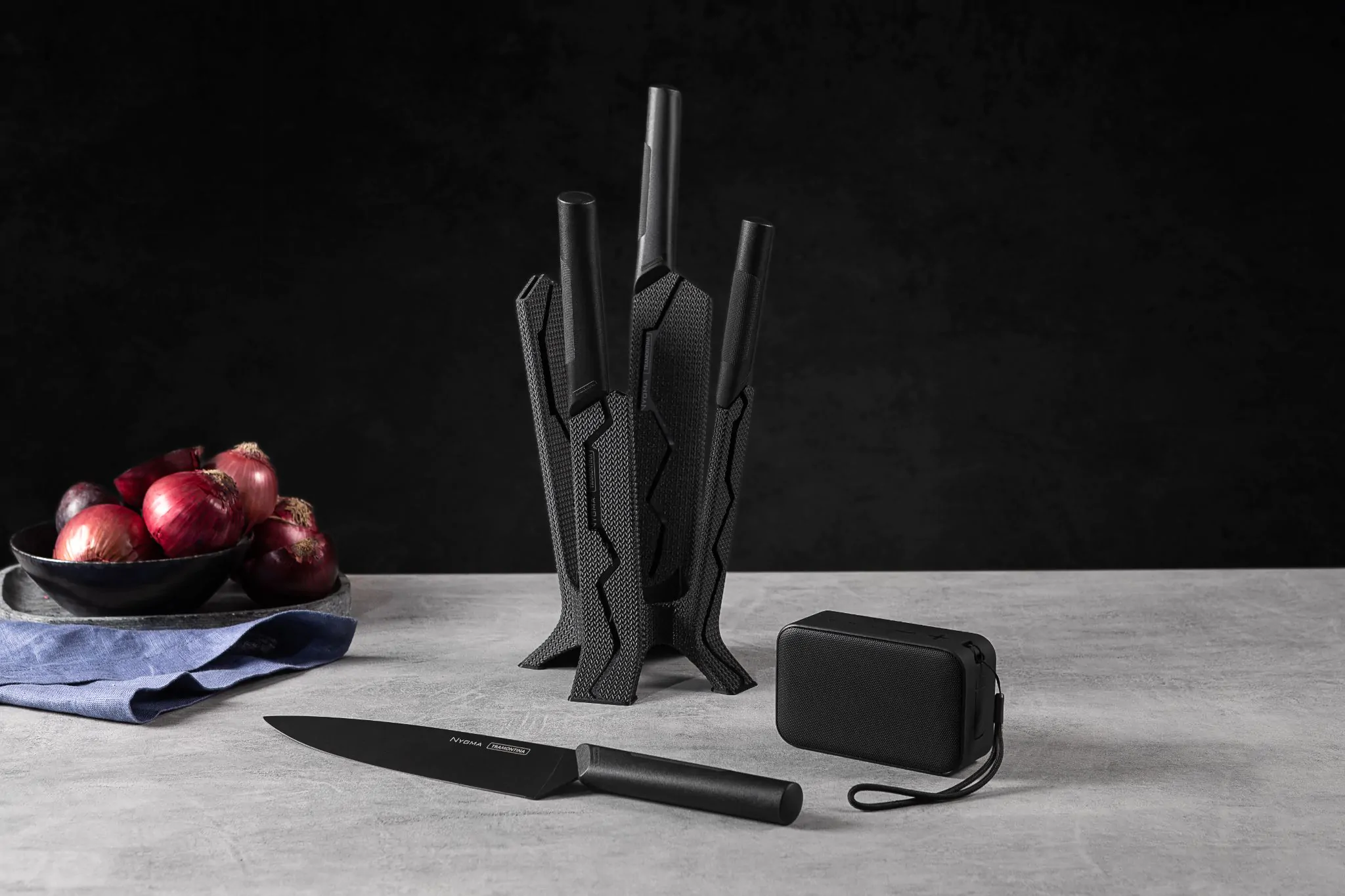A peça tem design contemporâneo e minimalista, mas cheio de personalidade, desenvolvida pela Design Único, em parceria com a Gate3D. A grande inspiração foram as facas da Linha Nygma, totalmente em preto. Produzidas em lâminas de aço inox revestidas na cor preta, que garantem maior capacidade de deslizamento, reduzindo o esforço durante o corte, elas têm cabos de polipropileno com textura especial (material atóxico com proteção antimicrobiana).
