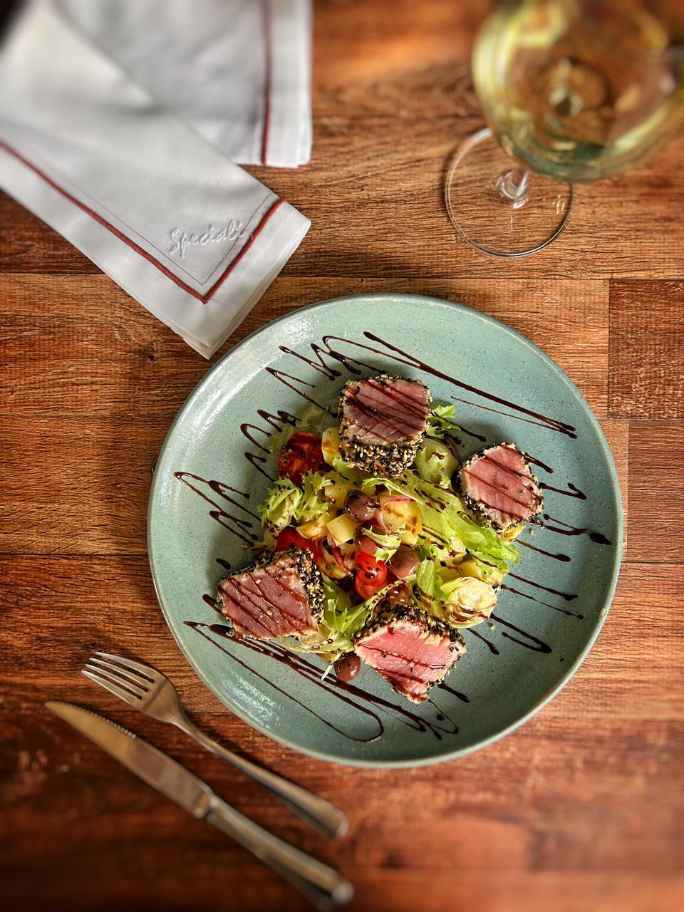 Outra proposta de prato principal do Speciali Trattoria é o atum selado com salada de batata com alcachofra