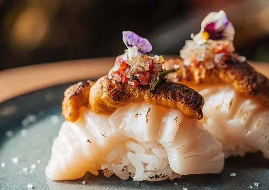 No sushi bar, o Niguiri Amazônico, utiliza-se o pirarucu, um peixe nativo da Amazônia. Selado e servido com molho tailandês, o prato é finalizado com abacaxi grelhado, que adiciona uma nota doce e ácida, complementando o sabor delicado do pirarucu, um peixe valorizado por sua carne firme e sabor suave.