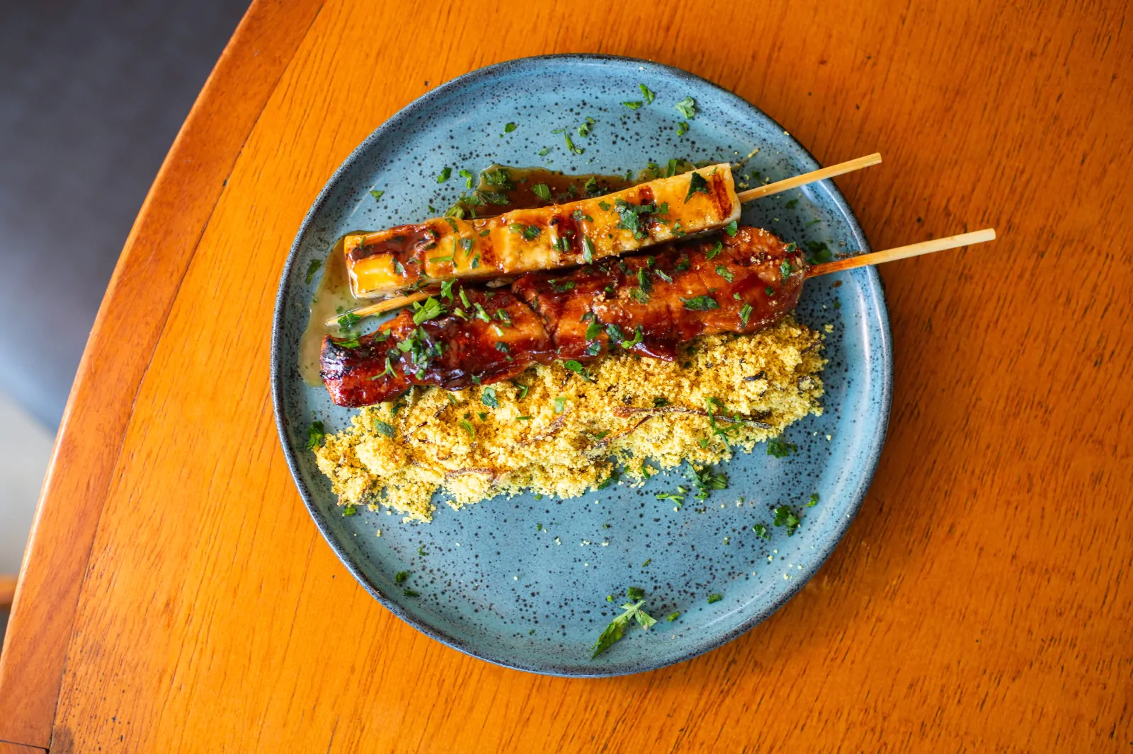 Prato participante: Dueto da Virada – espetinho de frango com bacon e barbecue de goiabada + espetinho de queijo coalho com melaço de cana, acompanhados de farofa de cebola