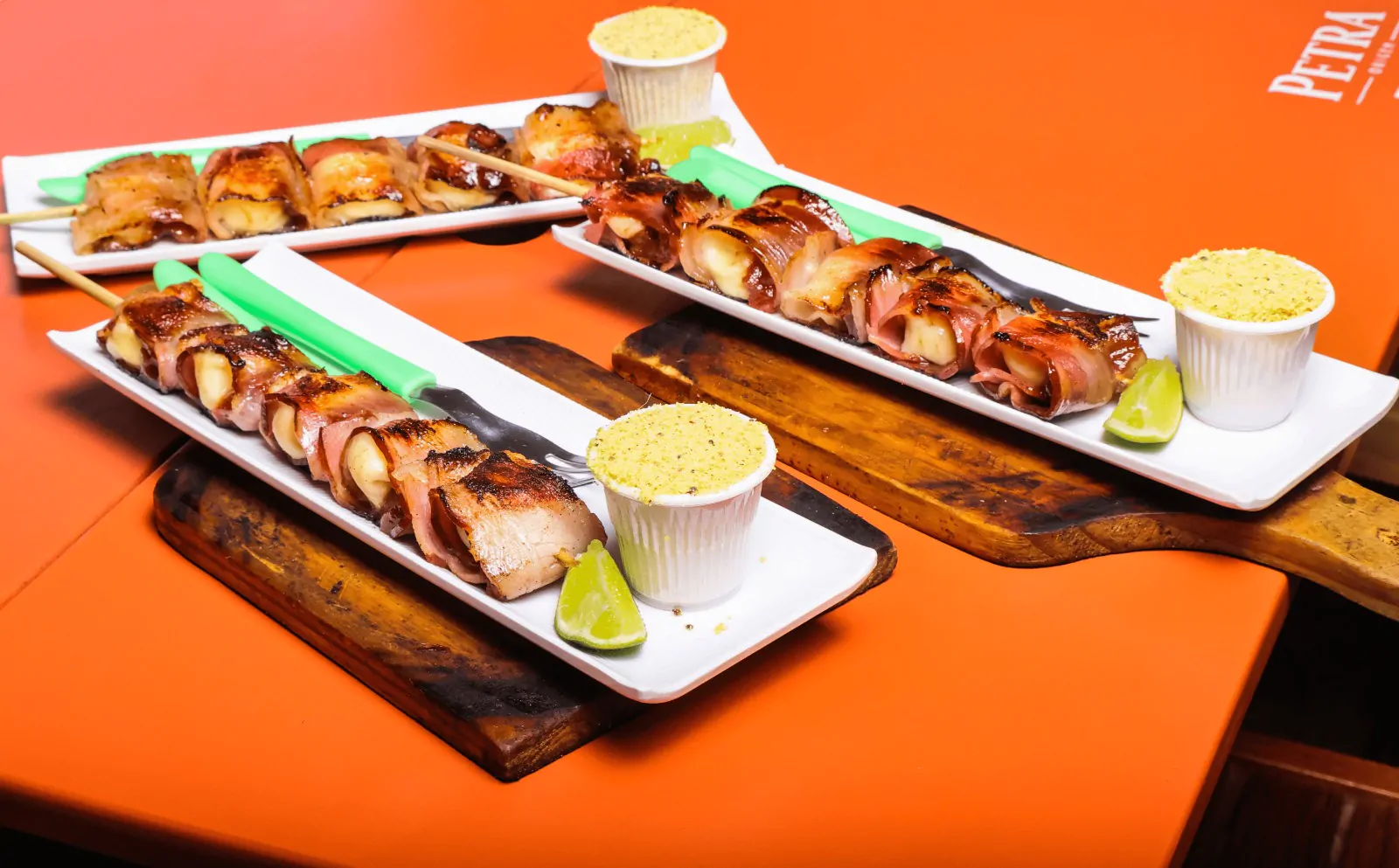 Espetinho Romeu e Julieta: goiabada, queijo muçarela e bacon
