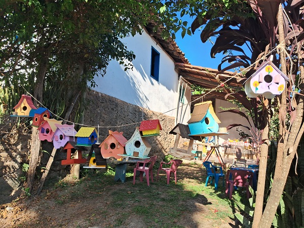 Alguns objetos estão sendo produzidos pela artista Karina Felipe, pelos moradores locais e em oficinas com adolescentes e crianças da região. Serão colocados alimentos como sementes, frutas e grãos para chamar os pássaros. Uma câmera de segurança vai filmar alguns registros das aves nas instalações que serão projetadas dentro da sala de cinema. Junto à instalação, também haverá algumas projeções dentro da sala do Cine.
