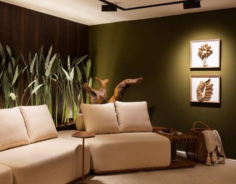 Inspirada na ancestralidade, sua paleta de tons terrosos e verdes conecta-se à força da natureza, enquanto sementes secas e flores do cerrado evocam memória, pertencimento e identidade brasileira. O design autoral, aliado à iluminação intimista, reforça a atmosfera acolhedora e sofisticada.