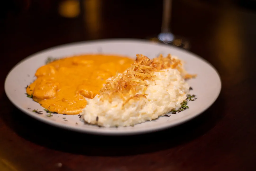 Prato Principal: Peixe do mar com mini lula e arroz de bobo de camarão. Ou New York Strip cara preta, gratin de batata com queijo maturado e farofa de limão capeta.