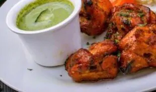 Entrada: Chickne tikka (Coxa de Frango marinada com Iogurte caseiro, Alho, Gengibre e Temperos, Assada no Forno Indiano Tandoor). Ou Fish pakora (peixe Branco, Farinha de grão de bico, Amido de Milho, Gergelim, Pasta de Alho e Gengibre e Temperos da Índia).