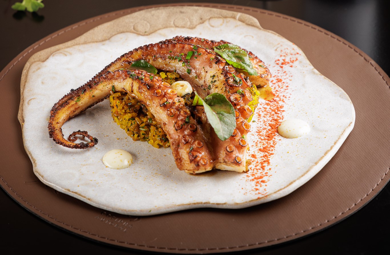 - Tempere a outra metade do polvo com hondashi e páprica, grelhe em frigideira quente com azeite;
