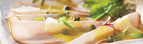 - Em um prato de servir, monte a salada, posicionando as fatias de peito de peru sobrepostas (forrando todo o fundo do prato);