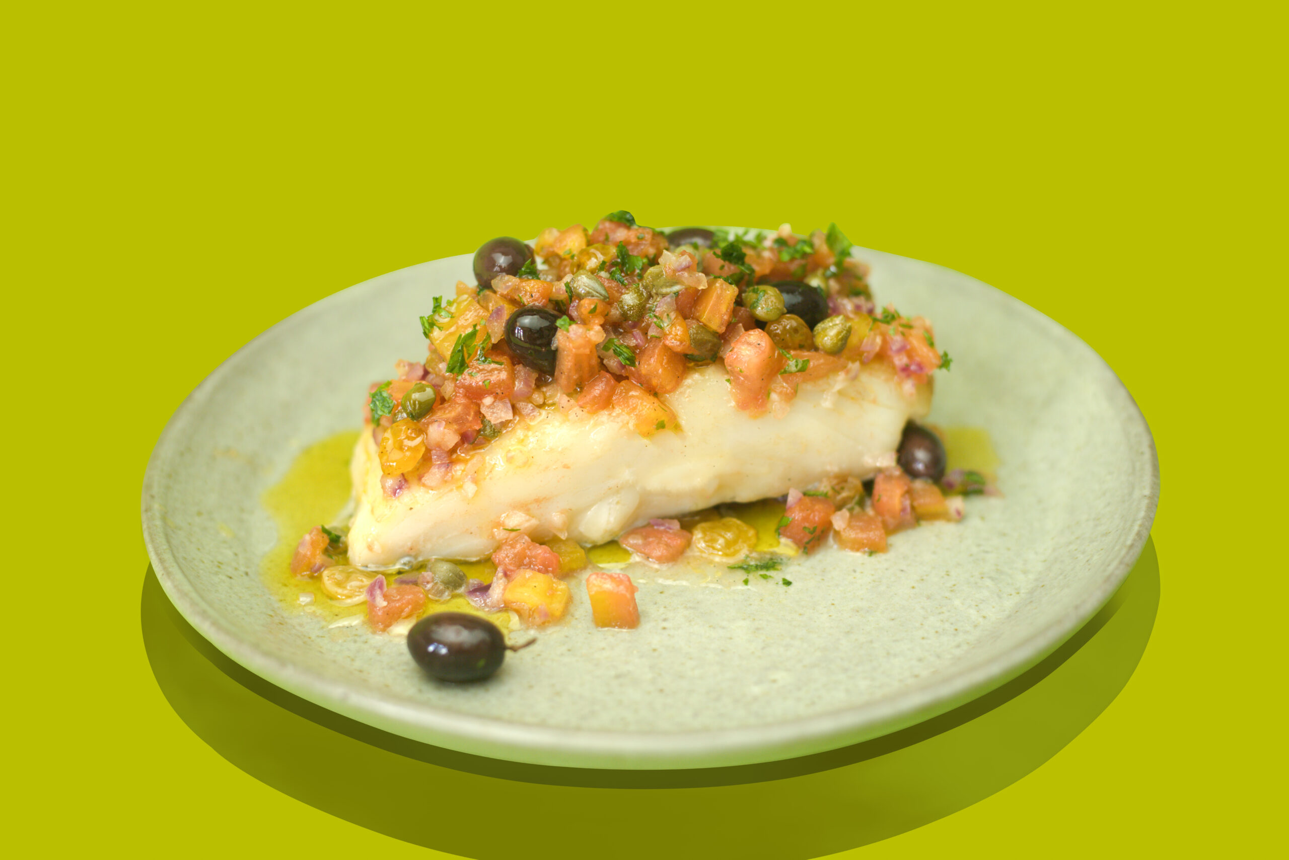 Pré-aqueça o forno 200°C. Numa travessa refratária coloque as postas de bacalhau, tempere-as com pimenta do reino e azeite e leve para assar por 20 minutos. Enquanto isso numa frigideira grande refogue a cebola e o alho num fio de azeite, junte o tomate, as passas, as azeitonas e as alcaparras. Deixe cozinhar por uns 5 minutos, acerte sal e pimenta do reino e desligue o fogo. Quando o bacalhau estiver pronto ligue o fogo novamente e coloque as postas na frigideira. Regue com o molho e cozinhe por mais 10 minutos com a panela tampada. Depois de pronto regue com bastante azeite e finalize com salsinha e manjericão.