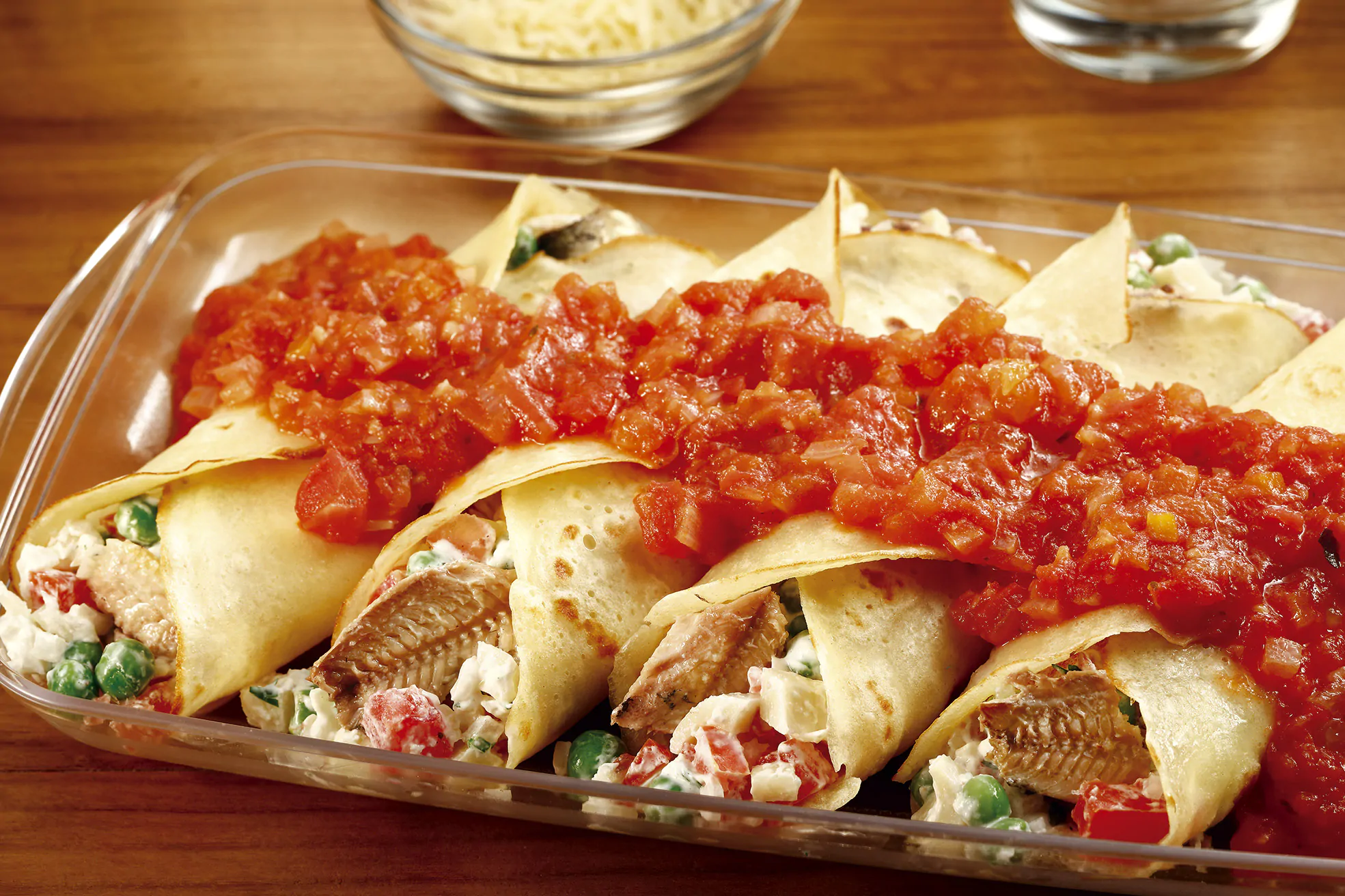 Recheie cada disco de massa com cerca de 2 a 3 colheres (sopa) do recheio de sardinha. Enrole como uma panqueca, monte 10 panquecas e distribua num refratário lado a lado. Despeje por cima o molho bem quente. Salpique com parmesão e sirva em seguida.