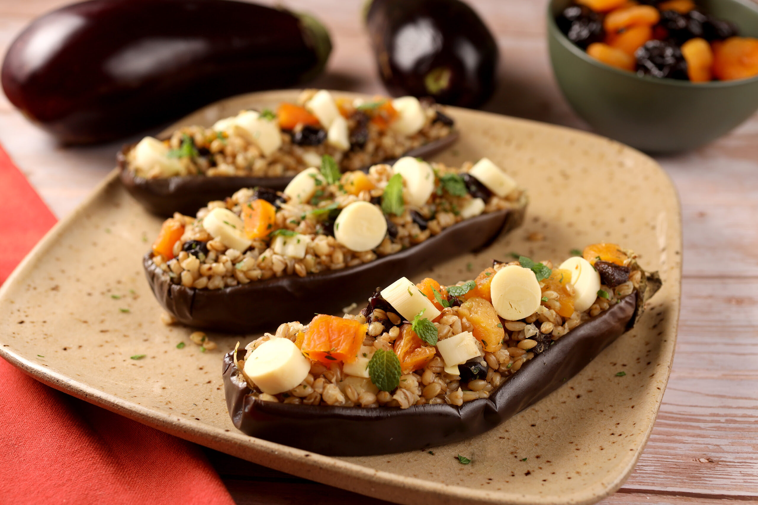 Refogue a cebola, o damasco e a ameixa no Azeite de Oliva Extra Virgem Castelo até amaciar. Regue com o Vinagre de Maçã 100% Natural. Retire do fogo e misture com a cevadinha cozida, o Palmito Pupunha, o sal, a hortelã e a salsa. Distribua sobre as metades de berinjelas cozidas e sirva fria ou quente.