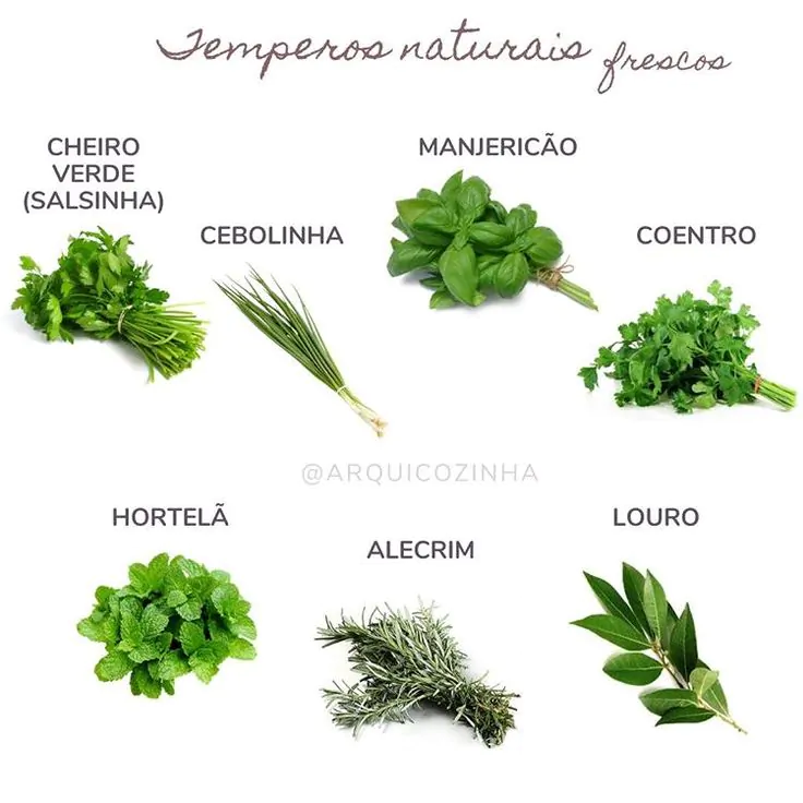 Alecrim: a erva possui um cheiro marcante, com sabor levemente azedo. Trata-se de uma opção bem versátil para quem gosta de cozinhar, podendo ser usado para temperar carne vermelha, frango, peixe e porco. Muitas pessoas utilizam o alecrim para aromatizar azeite e até mesmo manteiga. Também pode ser usado na preparação de pães, receitas com queijos e para temperar legumes. Batatas assadas com azeite e alecrim trazem um sabor marcante, por exemplo.