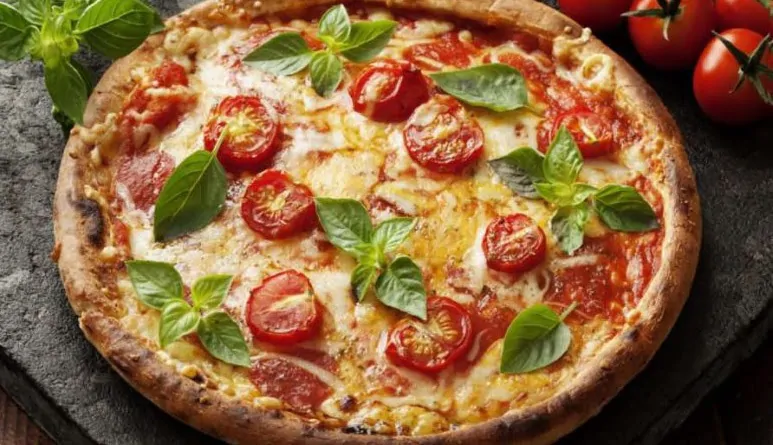 Coloque a mistura em uma forma de pizza, espalhe e leve ao forno por 20 minutos. Retire do forno, coloque o molho de tomate, a muçarela, o tomate cereja e o manjericão. Volte ao forno para gratinar, retire e sirva.