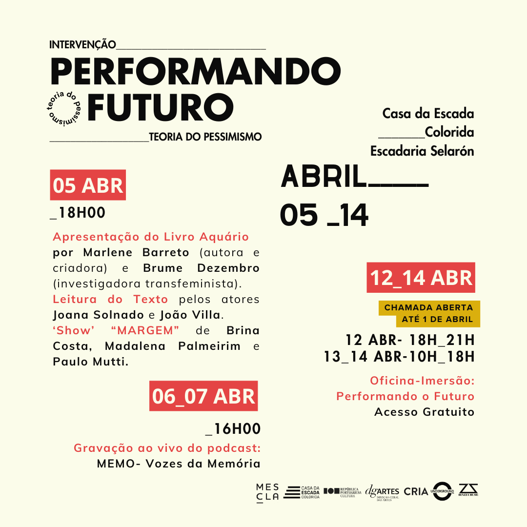 A abertura do evento, no dia 5 de abril, contará com a participação da investigadora travesti e transfeminista Brume Dezembro, que é também investigadora do projeto Teoria do Pessimismo que fará a mediação da apresentação do livro “Aquário”, além de uma leitura do texto pelos atores Joana Solnado e João Villa e ainda um grande destaque para o show MARGEM da brasileira Brina Costa, e da portuguesa Madalena Palmeirim que lideram a criação musical do projeto acompanhadas do artista Paulo Mutti.