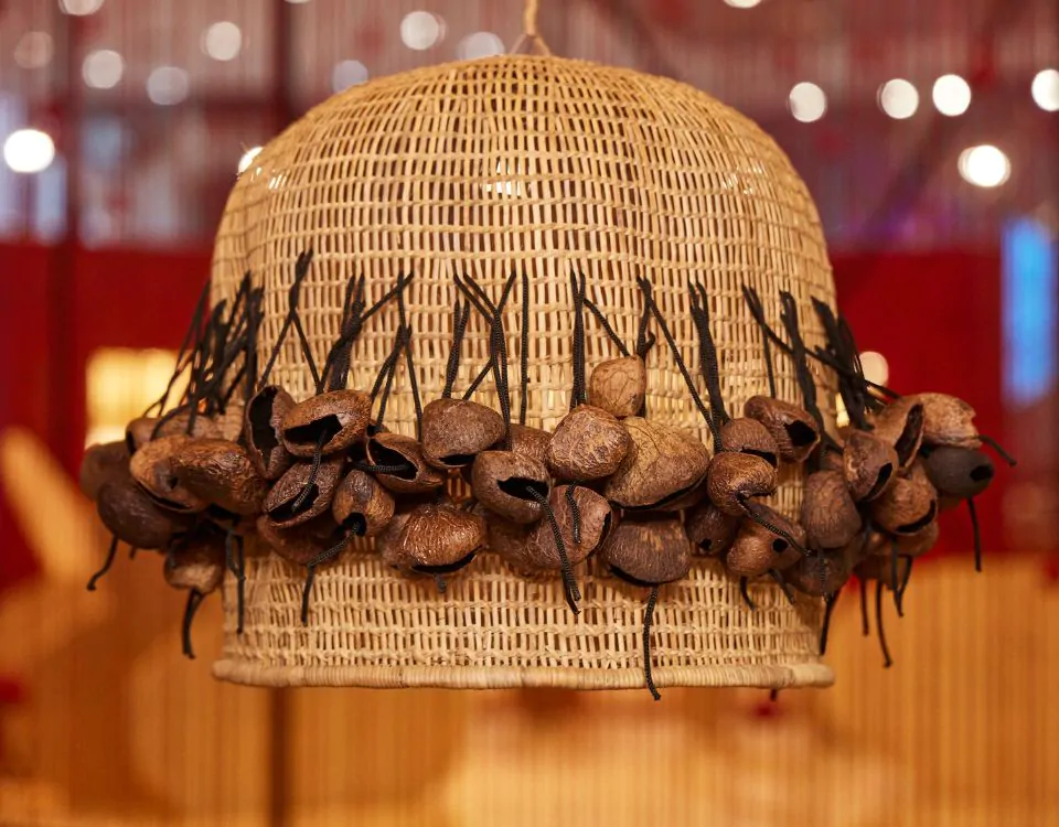 Na galeria da Casa Fiat de Cultura, grandes casulos de bambu e cabaças acolhem cadeiras de balanço que convidam à pausa. Combinando elementos táteis, sensoriais e sonoros, eles ativam a imaginação e a reflexão por meio de narrativas, músicas, histórias tradicionais e composições autorais entrelaçadas a sons da natureza, vozes e canções. Há também os casulos que podem ser colocados na cabeça, preparados com sementes e cascas que convidam os visitantes a experimentar novas sonoridades a partir do próprio movimento.