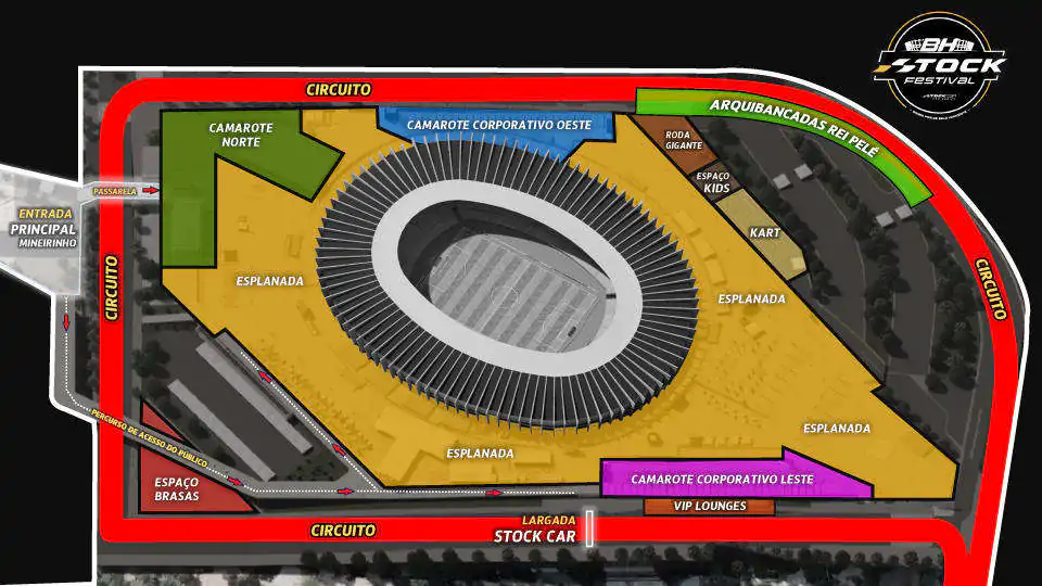 O BH Stock Festival apresenta um circuito emocionante, com cerca de 3.200 metros, que passa pelo entorno do Mineirão e segue pelas imediações. A reta principal do trajeto será na Avenida Coronel Oscar Paschoal, entre o Centro Esportivo Universitário (CEU) e o Hall de entrada do estádio. Os carros partirão em direção à Avenida Antônio Abrahão Caram e continuarão em direção à Avenida Rei Pelé.