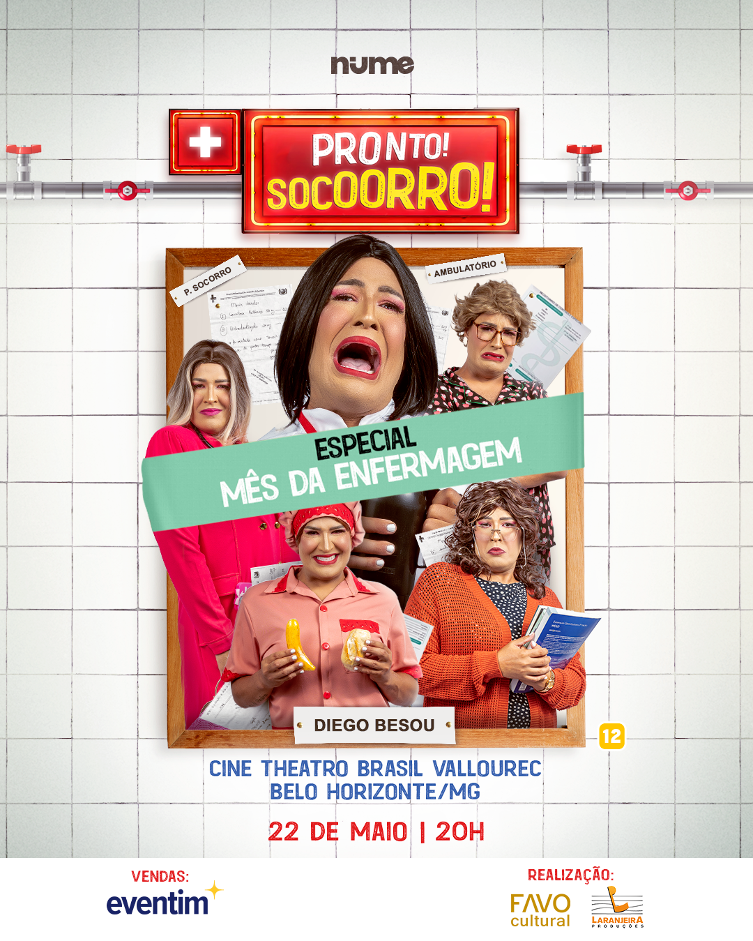 Diego Besou apresenta – Pronto! socoorro! no Grande Theatro Cine Brasil Vallourec Local: Cine Theatro Brasil Vallourec Horário: 20h Ingressos: EVENTIN Valores: Plateia I: R$90,00 / PLATEIA II: R$80,00 Endereço: Av. Amazonas, 315 – Centro / Praça Sete – Belo Horizonte – MG Meia-entrada de acordo com a Lei em vigor no site. Telefone:(31)3516-1360. Indicação: 12 anos. Duração: 80 minutos.