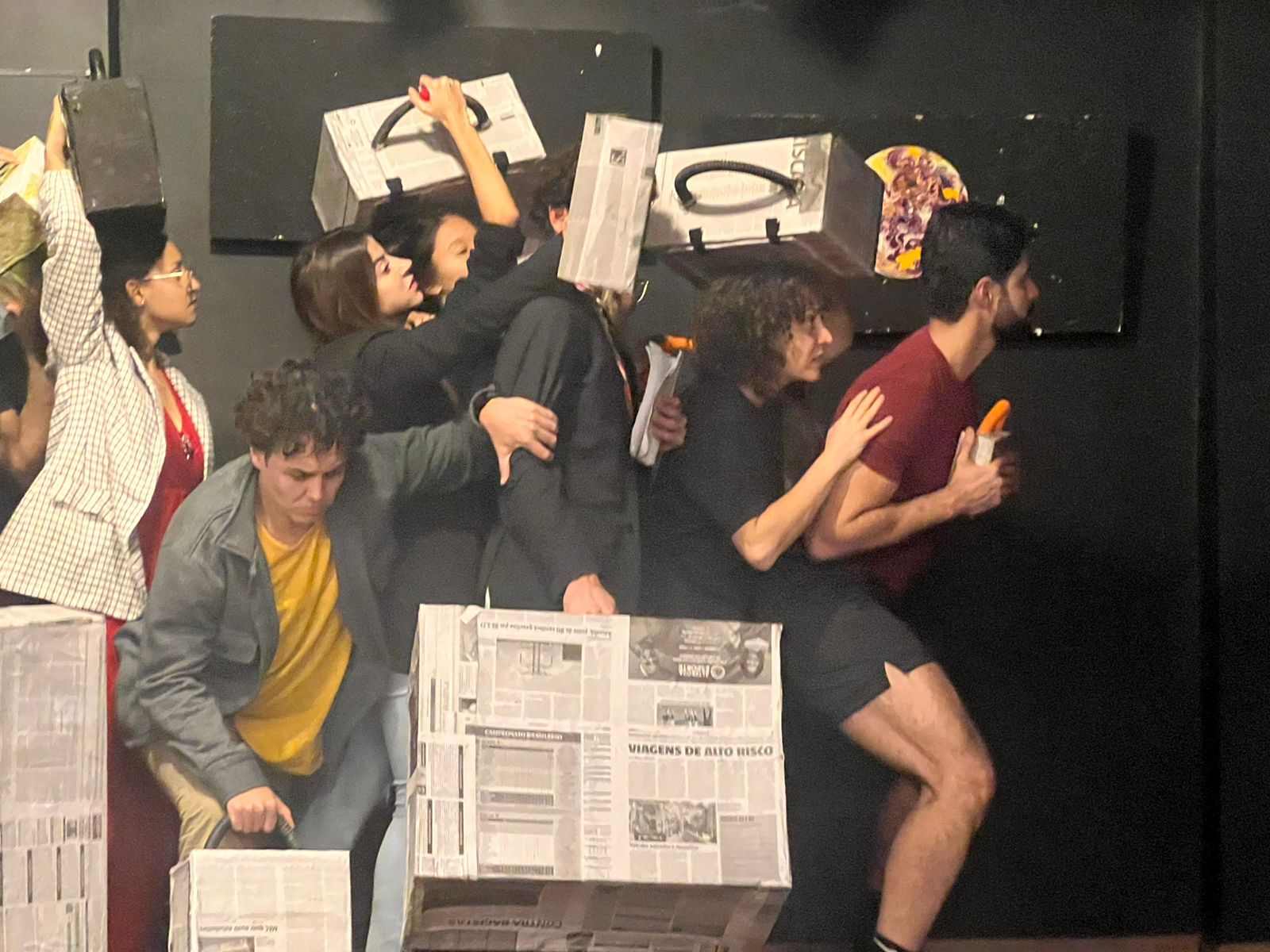 O espetáculo é orquestrado por uma trilha sonora ao vivo e o espectador é conduzido para o universo individual dos personagens, que passa por questões existenciais, nada diferente do contexto em que vivemos. É um convite à escuta de si mesmo e do outro, num mundo em que uma grande massa segue o fluxo, sem se dar conta para onde estão seguindo.
