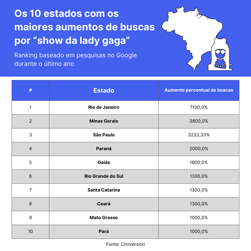 Simultaneamente, a especialista em SEO olhou para as buscas no Google pelo termo “show da Lady Gaga” em cada estado do Brasil. No período entre novembro de 2023 e dezembro de 2024, no qual ocorreram os primeiros indícios sobre a vinda da cantora ao Brasil, as buscas por “show da Lady Gaga” apresentaram um aumento de 7100,0% no estado do Rio de Janeiro.