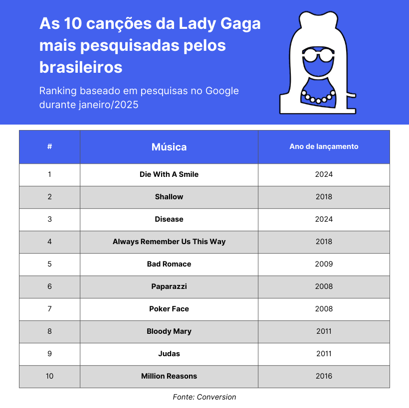Para entender quais músicas não podem faltar no show da cantora, a Conversion analisou as canções da artista mais buscadas pelos brasileiros no Google durante o mês de janeiro, posicionando-as quanto ao volume de buscas.