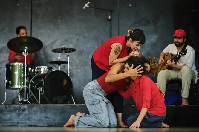 “O espetáculo nasceu da vontade de reunir artisticamente pessoas que fizeram parte de diferentes momentos da minha vida, pessoas com quem eu trabalhei de diferentes maneiras. Algumas não se conheciam, outras já haviam trabalhado juntas em outros contextos. Então, tem essa ideia do reencontro”, explica Carol Vilela, idealizadora do projeto, que surgiu em 2022 e estreou um ano depois, no Circuito Municipal de Cultura. “Tinha um pouco desse momento pós-pandemia, de querer estar junto, e também de entender como fazer dialogar essas diferentes linguagens no campo da improvisação”, completa a artista.