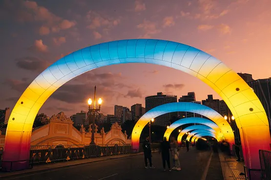 Um dos destaques na Festa da Luz deste ano em Belo Horizonte, a obra “Foco”, do artista e arquiteto Ricardo Bizafra, leva à Praça do Mercado seu túnel de luz, formado por dez grandes arcos infláveis coloridos que guiam o olhar do público. Do mesmo local, será possível admirar a instalação “Paisagens Digitais”, do Homem Gaiola, que utiliza laser mapping para criar contornos luminosos pelos edifícios.