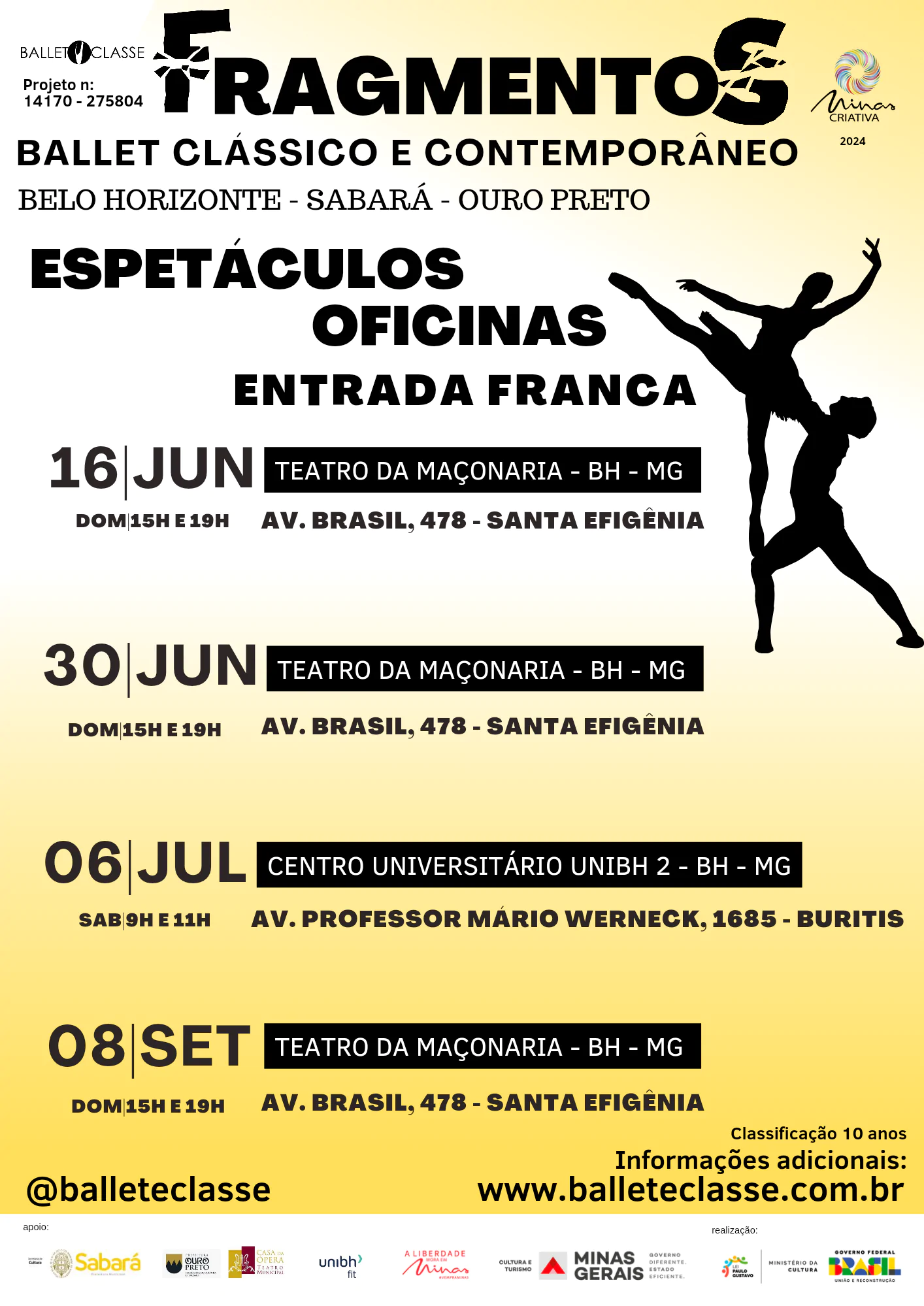 Criado pelo Studio Ballet e Classe, o projeto Fragmentos, de n° 14170 – 275804, integra o Edital LPG 09/2023 – Programa de mobilidade de artistas, grupos e técnicos. Apoios: Secretaria Municipal de Cultura de Sabará, Teatro Municipal de Ouro Preto – Casa da Ópera, UNIBH e Secretaria de Estado de Cultura e Turismo de Minas Gerais. Realização: Lei Paulo Gustavo – Ministério da Cultura.
