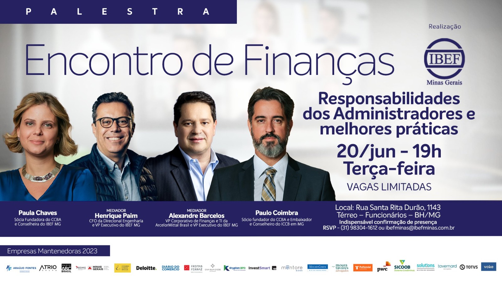 O Instituto Brasileiro de Executivos de Finanças (IBEF-MG), sempre com o objetivo de fomentar o debate entre executivos e profissionais de finanças, mais um Encontro de Finanças. Na pauta as “Responsabilidades dos administradores e as melhores práticas”.
