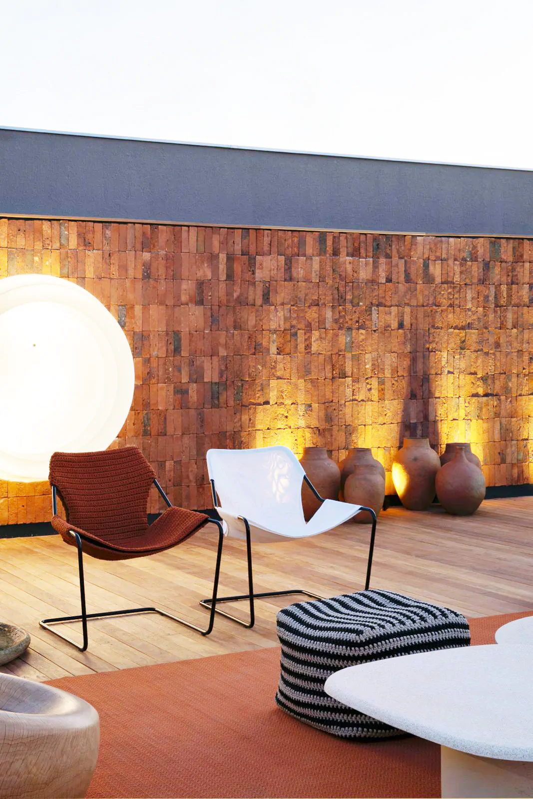 Quem passar pelo terraço do Espaço 356, da CASACOR Minas, ambientado pela Lodi Motta Arquitetura, poderá encontrar alguns dos produtos da marca, feitos especialmente para o evento, como a versão em crochê da icônica cadeira Paulistano e os puffs da Coleção Outdoor.