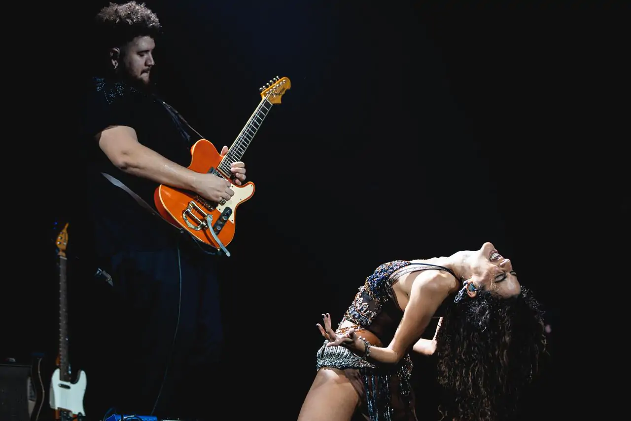 A banda, que veio robusta com violão, guitarra, bateria, percussão, trompete, trombone, sax barítono, flugel, sax tenor, flauta, baixo e synth bass, ganhou protagonismo, reforçando a pulsação intensa do show. A percussão e os sopros criaram a base para uma performance ainda mais livre, vibrante e conectada com a entrega visceral de Marina. Em cena, a artista transita entre a música e o teatro, resgatando a Marina mais instintiva, sem perder o frescor de novidade.