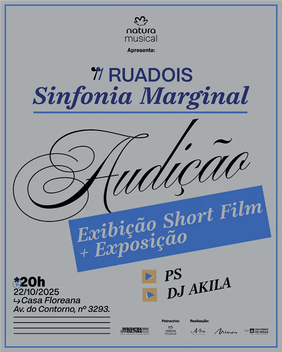 Em celebração a coletividade e cumplicidade que acompanha o trio, ruadois estreia o disco Sinfonia Marginal em audição gratuita para o público, marcada para o dia 22 de novembro, na Casa Floreana, em Belo Horizonte, basta retirar os ingressos grátis com antecedência no Shotgun (garanta já). Além das barras da Sinfonia Marginal, à noite conta a discotecagem de DJ Akila e PS, um dos principais produtores do projeto.