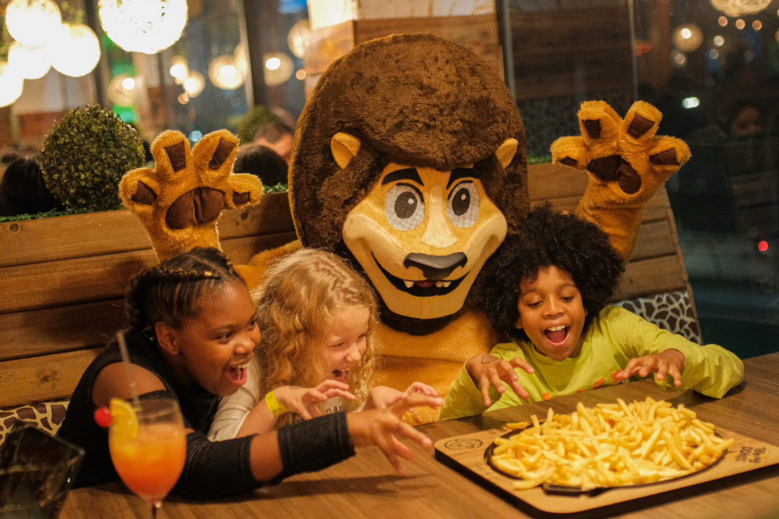 A experiência ainda envolve o ambiente, todo decorado com o tema da selva e adaptado de acordo com as datas comemorativas. Os móveis revestidos com estampas, as estruturas de madeira, folhagens e itens que remetem aos animais da selva deixam todos no clima do local, junto com os telões e trilha sonora.