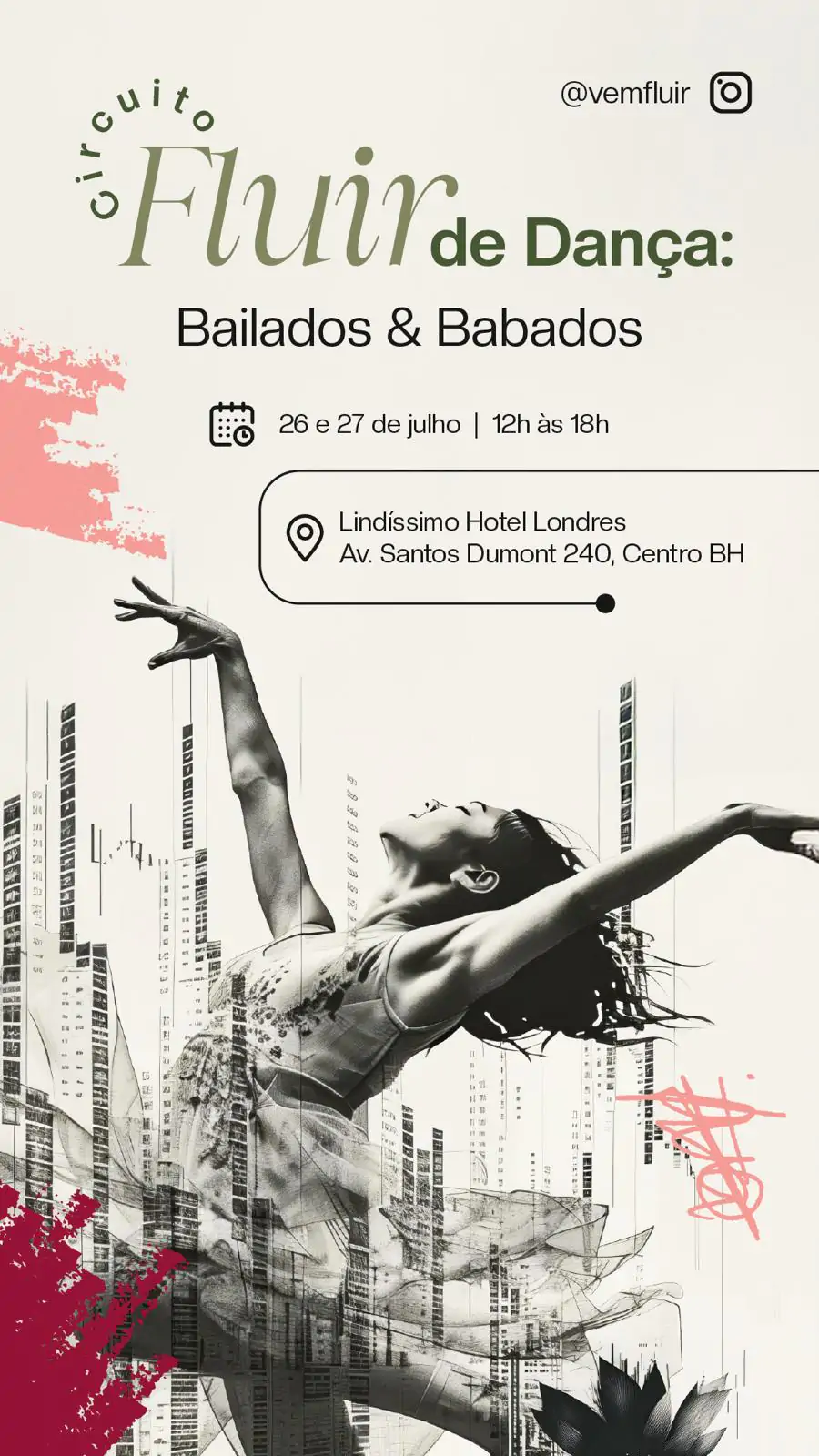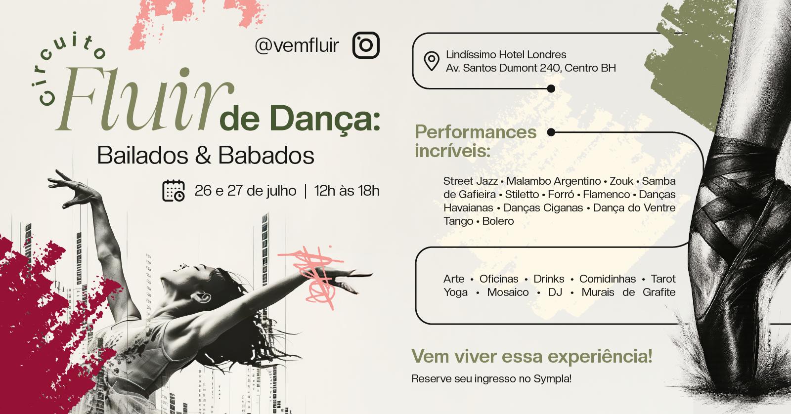 É com grande alegria que anunciamos o primeiro Circuito Fluir de Danças, Bailados e Babados, um evento colaborativo que reúne várias escolas profissionais de dança em um só lugar! Nos dias 26 e 27 de julho, das 12h às 18h, você está convidado a participar de uma programação espetacular repleta de apresentações de dança, arte e cultura.